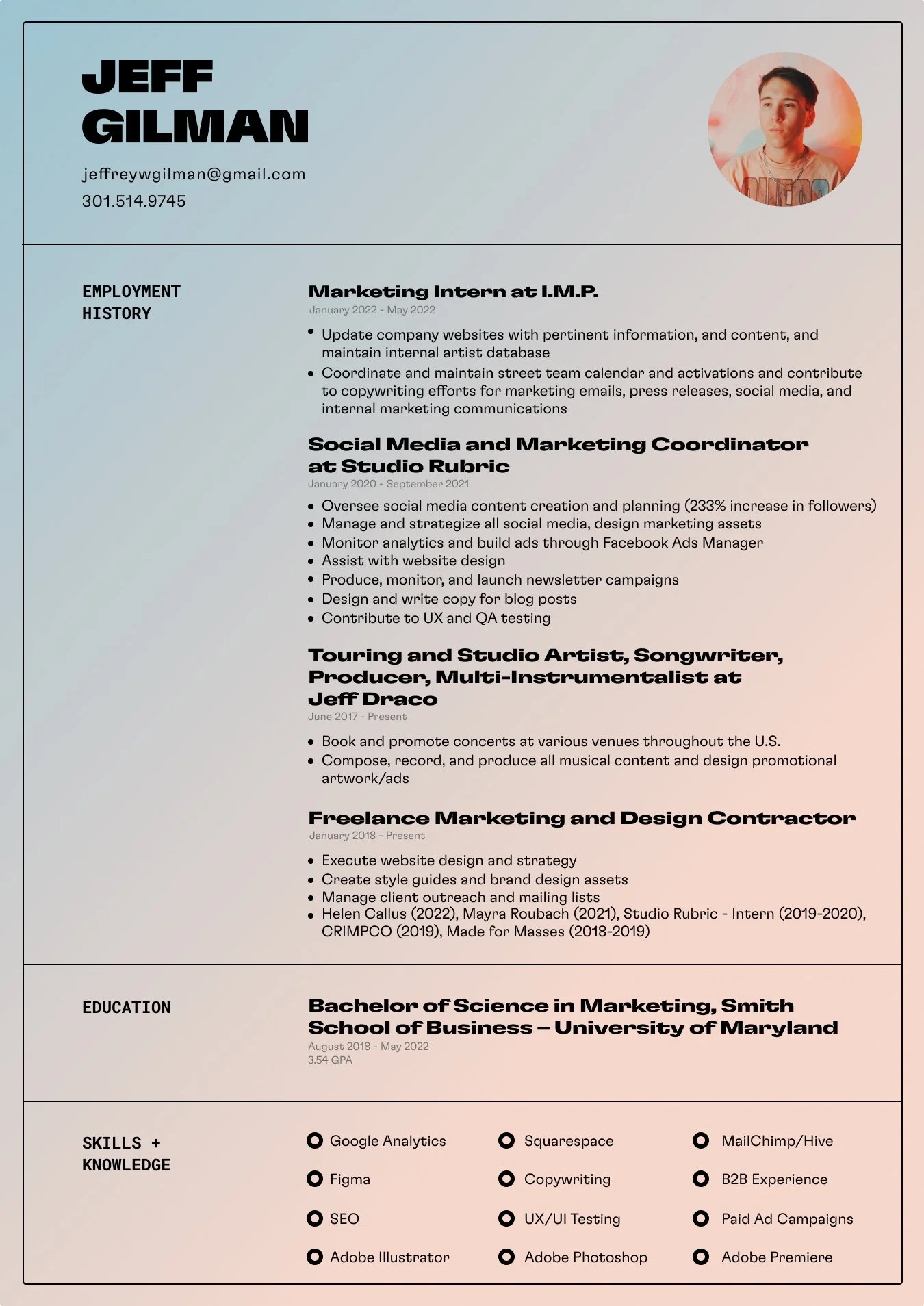 I am a creative, artist, musician, marketer, and designer. I have worked as a freelancer and directly under studios across a diverse roster of industries. Notable clients include New York Magazine, Mark Maron, Heggerty, I.M.P., Union Stage Presents, and often in collaboration with Squarespace. I am currently in search of branding, marketing, or design work.